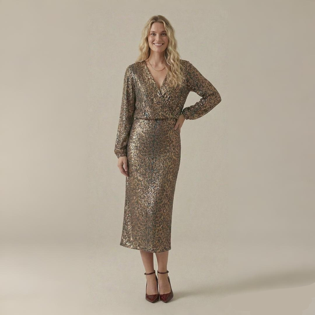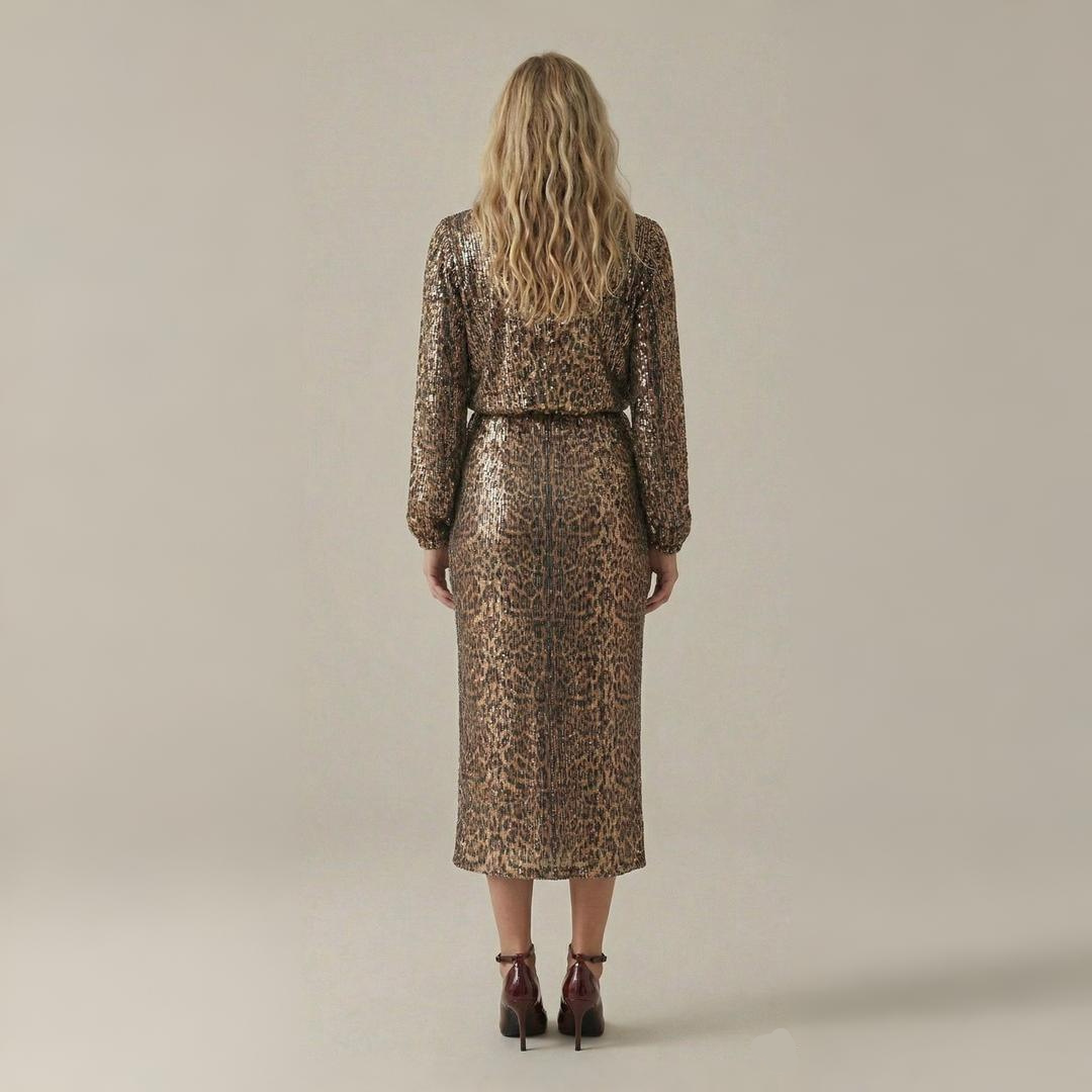 Naomi seelik on tõeline pilgupüüdja, mis on loodud neile, kes armastavad silma paista. Särava leopardi mustri ja läikivate litritega seelik pakub luksuslikku ja pidulikku välimust. Elegantne lõhik ees lisab mängulise ja naiseliku puudutuse, samas kui liibuv lõige rõhutab stiilselt figuuri. Ükskõik, kas kannate seda komplektina või eraldi, toob see seelik igasse ruumi energiat ja elegantsi.
