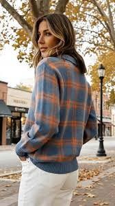 Elise kampsun ühendab kudumi mugavuse nööbitava särgi rafineeritud välimusega. Sellel on struktuurne krae ja nööbid ees, mis lisavad teie igapäevariietusele elegantsi. Pehme ruuduline muster soojades sinistes ja roostepruunides toonides annab sellele ajatu hooajalise võlu, olles ideaalne sügis- ja talvepäevadeks.