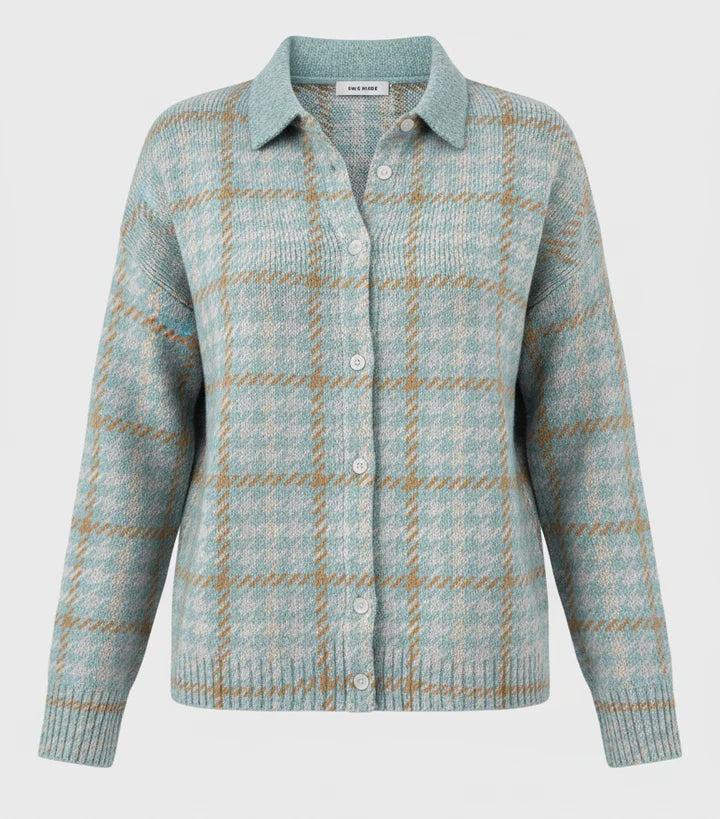 Elise kampsun ühendab kudumi mugavuse nööbitava särgi rafineeritud välimusega. Sellel on struktuurne krae ja nööbid ees, mis lisavad teie igapäevariietusele elegantsi. Pehme ruuduline muster soojades sinistes ja roostepruunides toonides annab sellele ajatu hooajalise võlu, olles ideaalne sügis- ja talvepäevadeks.